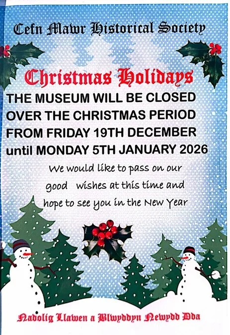 Please note that Cefn Mawr and District Museum will be closed for the Christmas holidays from Friday 19th December 2025 until Monday 5th January 2026.